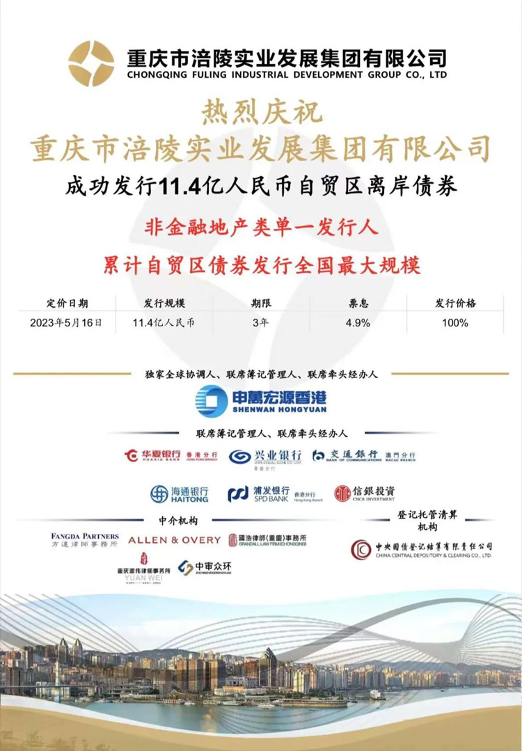 2023年5月16日,重慶市涪陵實業(yè)發(fā)展集團有限公司成功純信用發(fā)行上海自由貿(mào)易試驗區(qū)人民幣債券11.4億元,期限3年,票面4.9%/年,創(chuàng)非金融地產(chǎn)類單一發(fā)行人累計自貿(mào)區(qū)債券發(fā)行全國最大規(guī)模。這是市場對涪發(fā)集團的肯定,也是涪發(fā)集團在資本市場上的里程碑,涪發(fā)集團將會結(jié)合自身優(yōu)勢,穩(wěn)扎穩(wěn)打,為涪陵區(qū)發(fā)展貢獻力量。