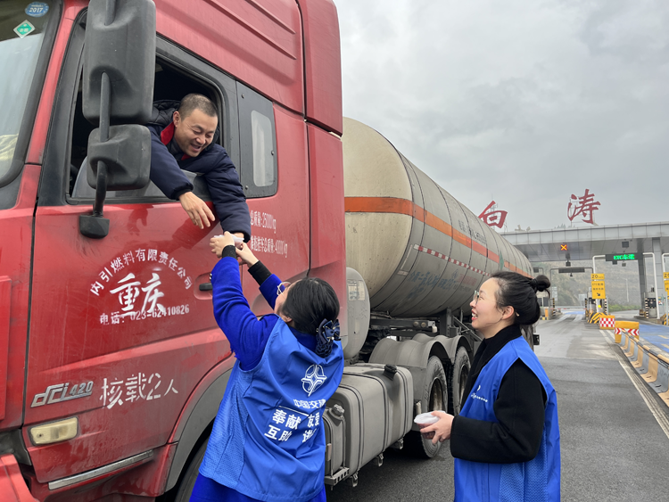 在白濤收費(fèi)站外廣場,白濤站收費(fèi)員工設(shè)立便民服務(wù)臺,穿上藍(lán)馬甲,為過往司乘送上一碗碗臘八粥,并溫馨提醒他們在冬日出行注意行車安全,一路平安。