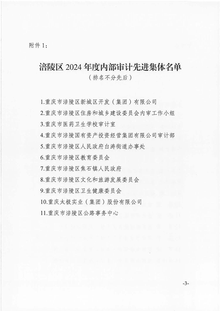 2025年9月,涪陵區(qū)內(nèi)部審計(jì)協(xié)會發(fā)布《關(guān)于表揚(yáng)2024年度先進(jìn)集體、先進(jìn)個(gè)人及內(nèi)部審計(jì)優(yōu)秀項(xiàng)目的通報(bào)》(涪陵內(nèi)審協(xié)發(fā)〔2025〕6號),國投集團(tuán)審計(jì)部獲得“涪陵區(qū)2024年度內(nèi)部審計(jì)先進(jìn)集體”表彰,國投集團(tuán)內(nèi)審項(xiàng)目《2023年砂石銷售業(yè)務(wù)專項(xiàng)審計(jì)》獲得“涪陵2024年度內(nèi)部審計(jì)優(yōu)秀項(xiàng)目”表彰。